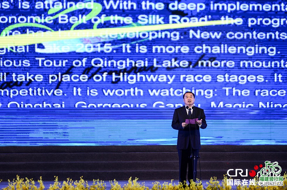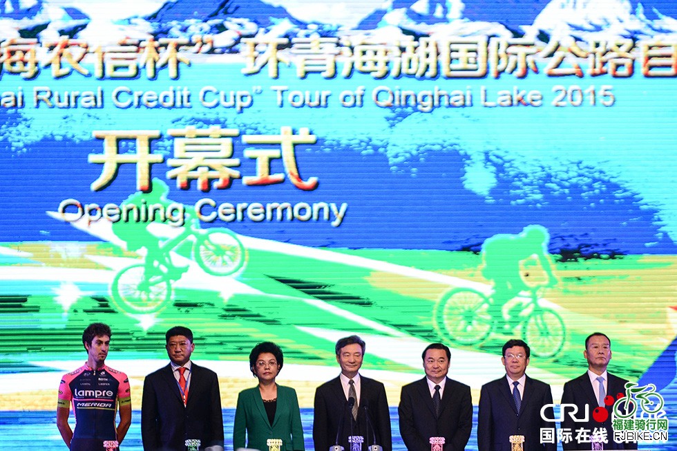 全国政协副主席罗富和出席开幕式并宣布第十四届环湖赛开幕。青海省委副书记、省长郝鹏,宁夏回族自治区党委副书记、自治区政府主席刘慧,青海省委副书记王建军,青海省委常委、西宁市委书记王晓,青海省委常委、省委宣传部长张西明,青海省委常委、省委秘书长王予波,青海省人大常委会副主任苏宁,甘肃省副省长夏红民,青海省副省长高华、韩建华,青海省政协副主席王小青,青海省军区副司令员昂旺索南,武警青海总队司令员杨雄埃,国家体育总局代表王伟,国家新闻出版广电总局代表吴宝安,宁夏回族自治区政府秘书长王紫云,中央电视台体育频道代表史志刚,中国野生动物保护协会代表李青文,中国绿化基金会副代表陈蓬等嘉宾出席开幕式。 国自盟主席布莱恩·库克森向第十四届环湖赛开幕发来贺词。